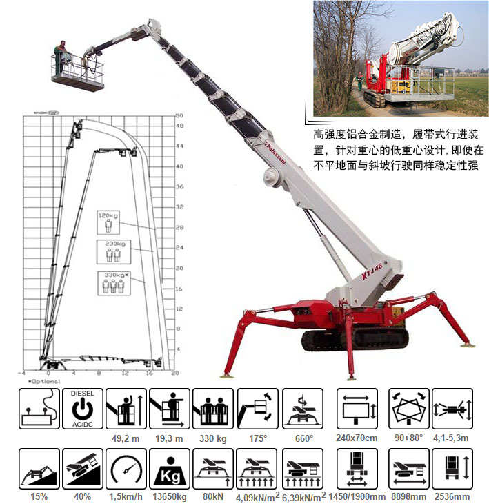 · XTJ48.1蜘蛛式登高車最大行車時速為2.25公里,爬坡能力為25%。